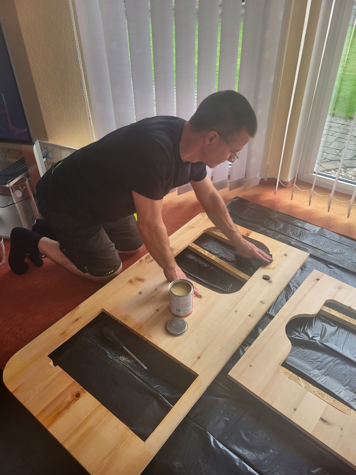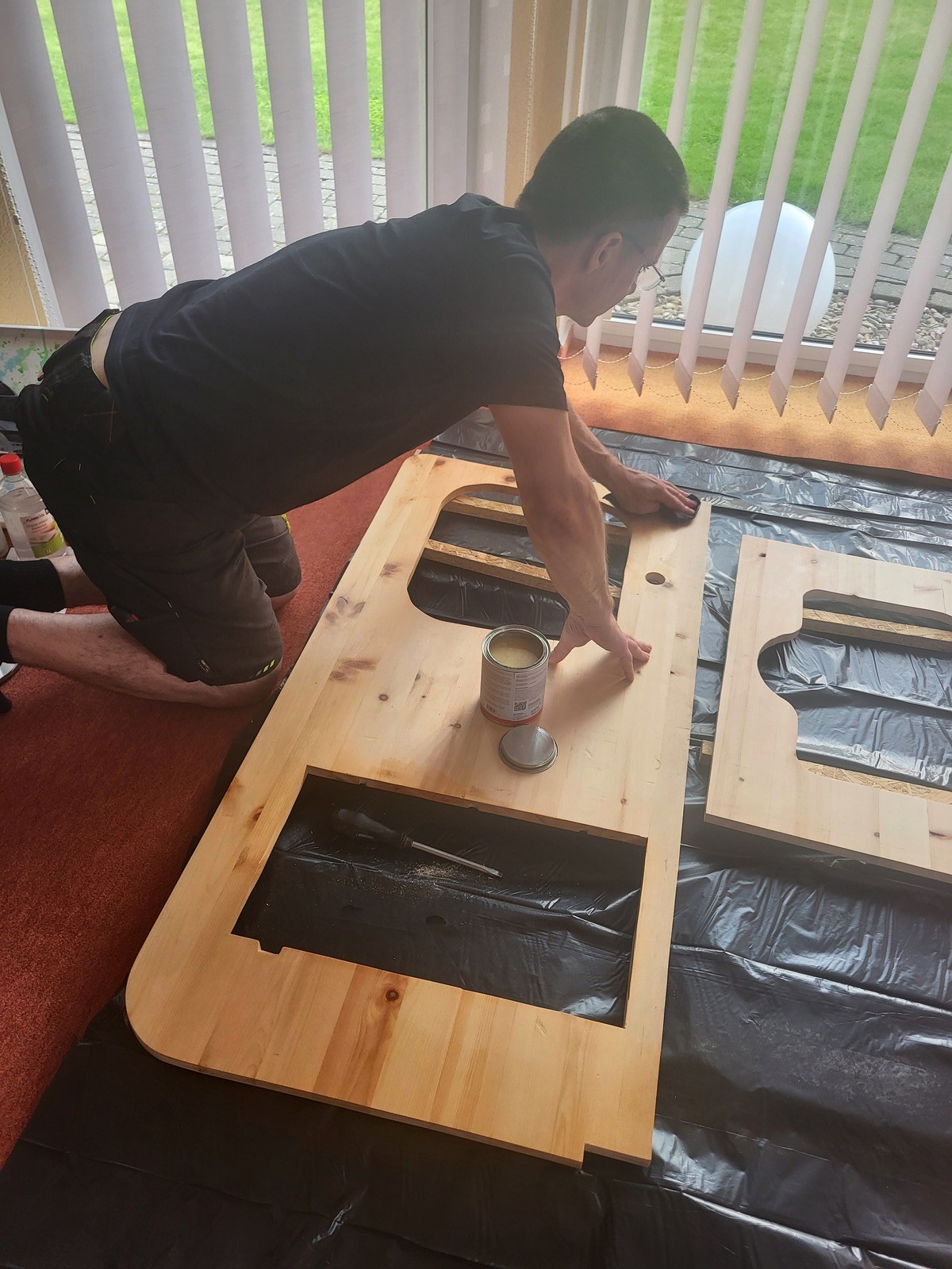 Am "Lagerort" der letzten Monate bekommen die Zirbenholzplatten ihre Ölung...
