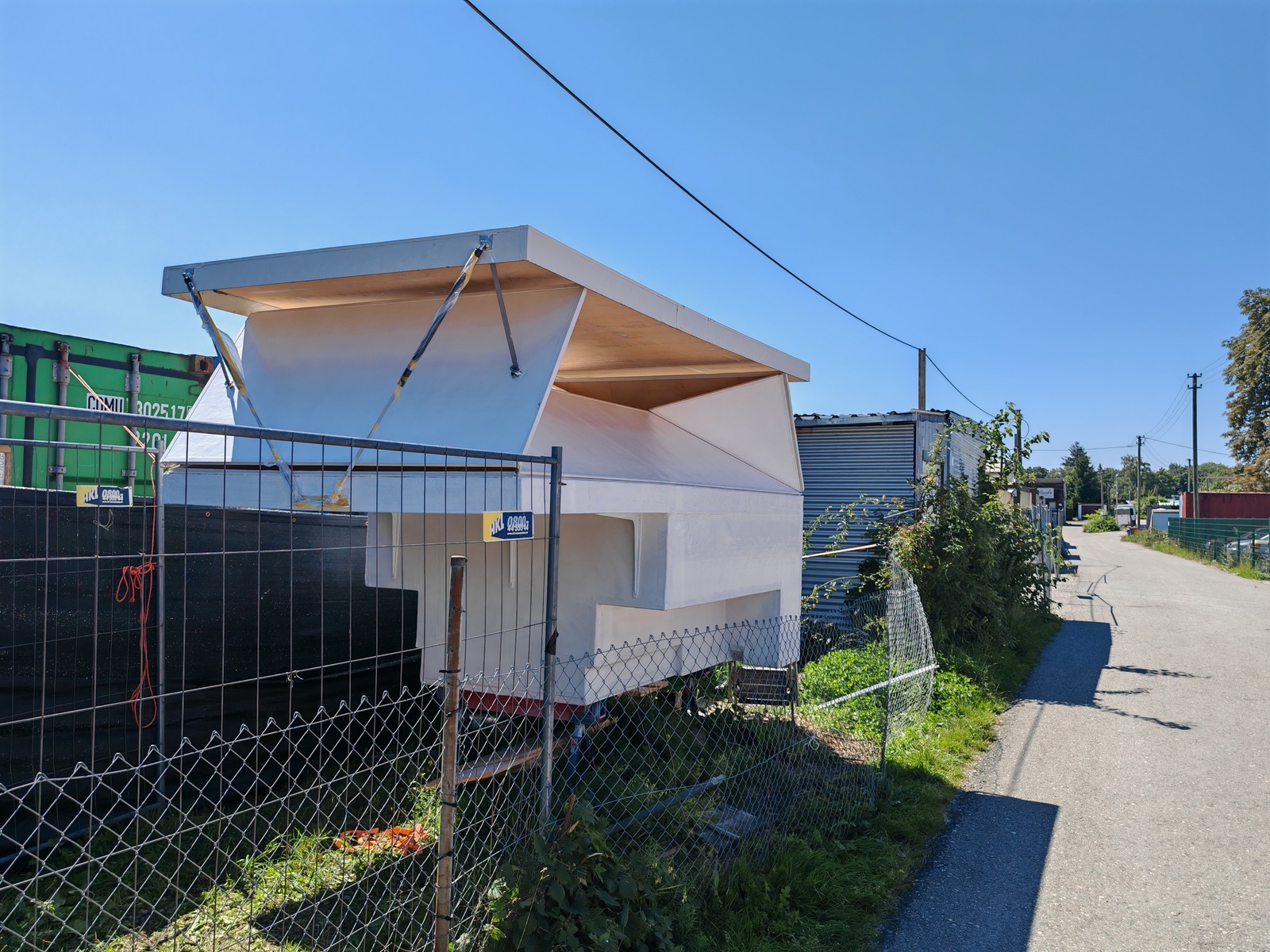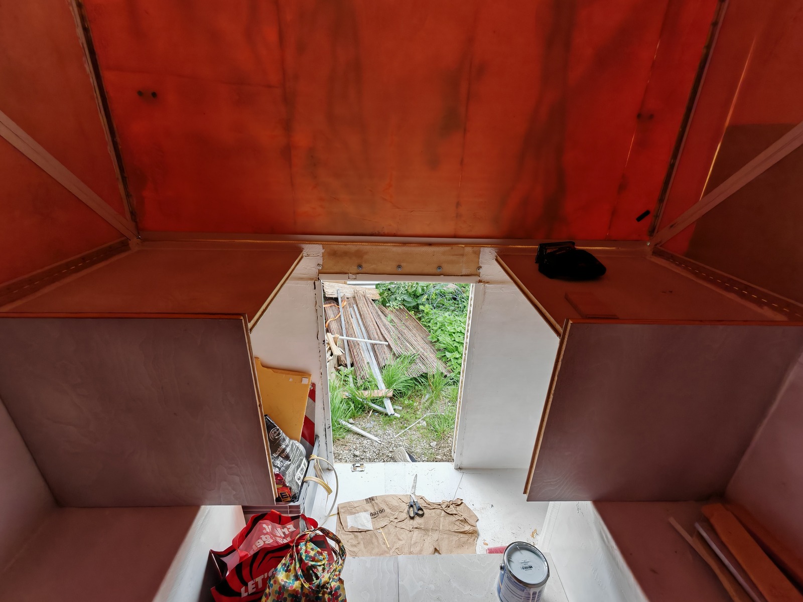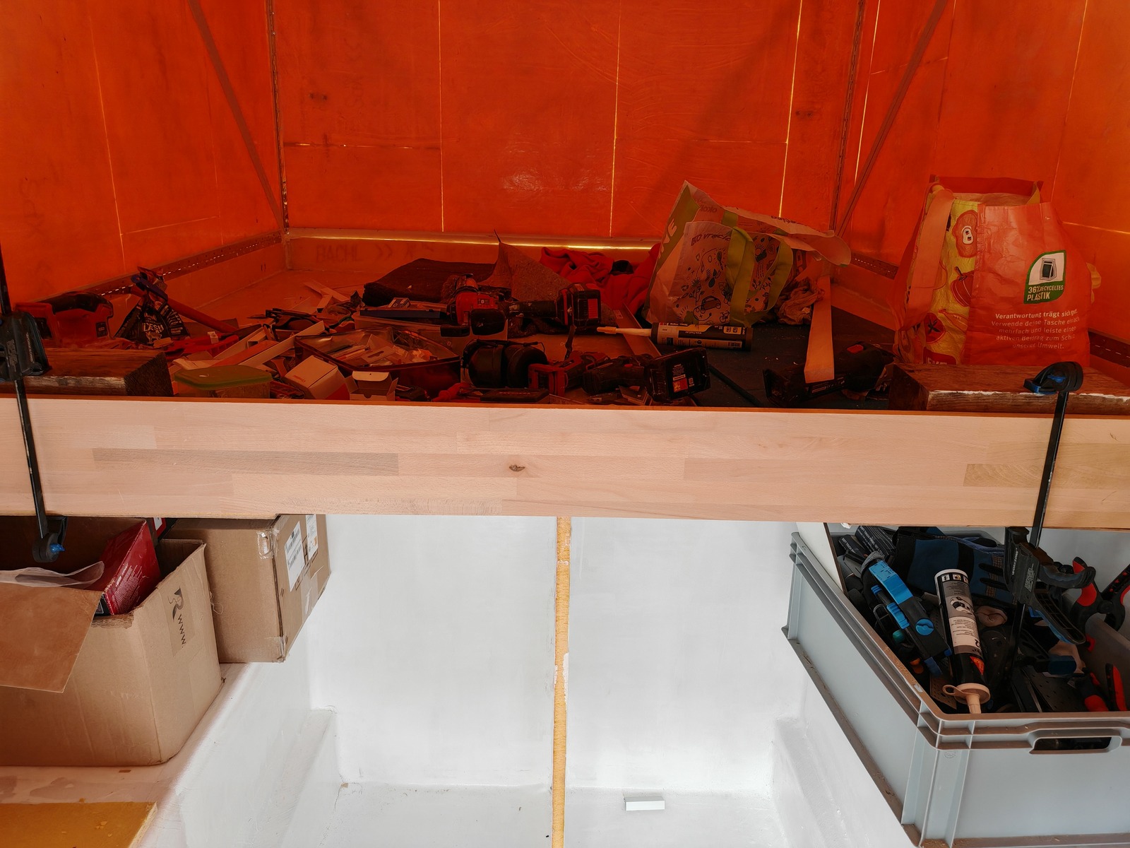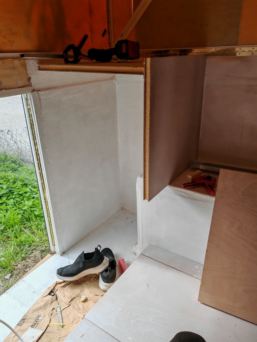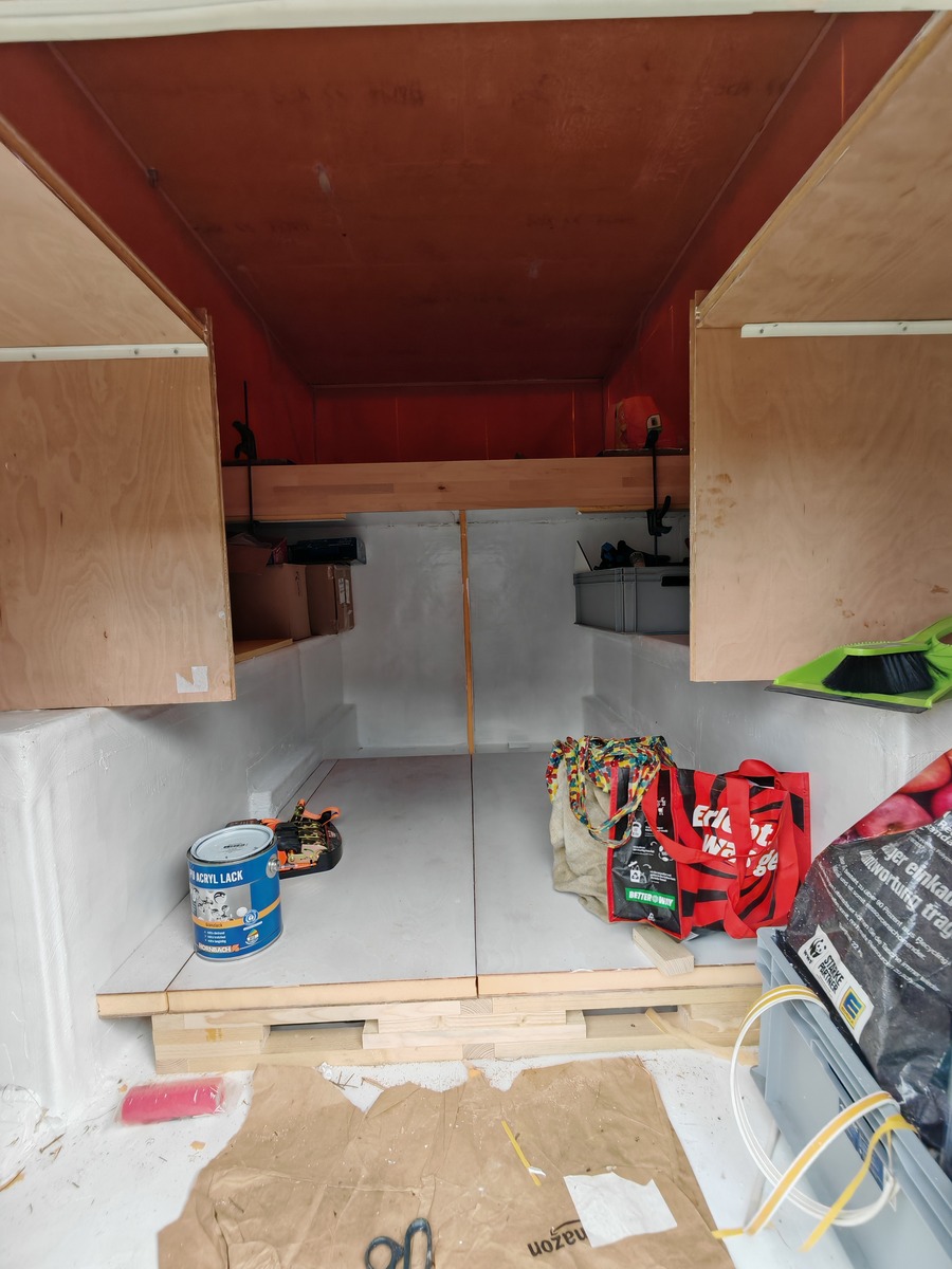 Innen ist auch schon ein bisschen passiert, linke und rechts sind die Regalwände eingeklebt. Unten am Boden hat es inzwischen einen Doppelboden. Platten habe aus Zuschnitt im Baumarkt und Resten XPS selber geklebt. Kanten werde ich bei Zeiten noch schon machen. Ich brauche Stauraum in der Kabine, da ich den Container Englisch wieder räumen will. Spare ich etliches an Geld.
