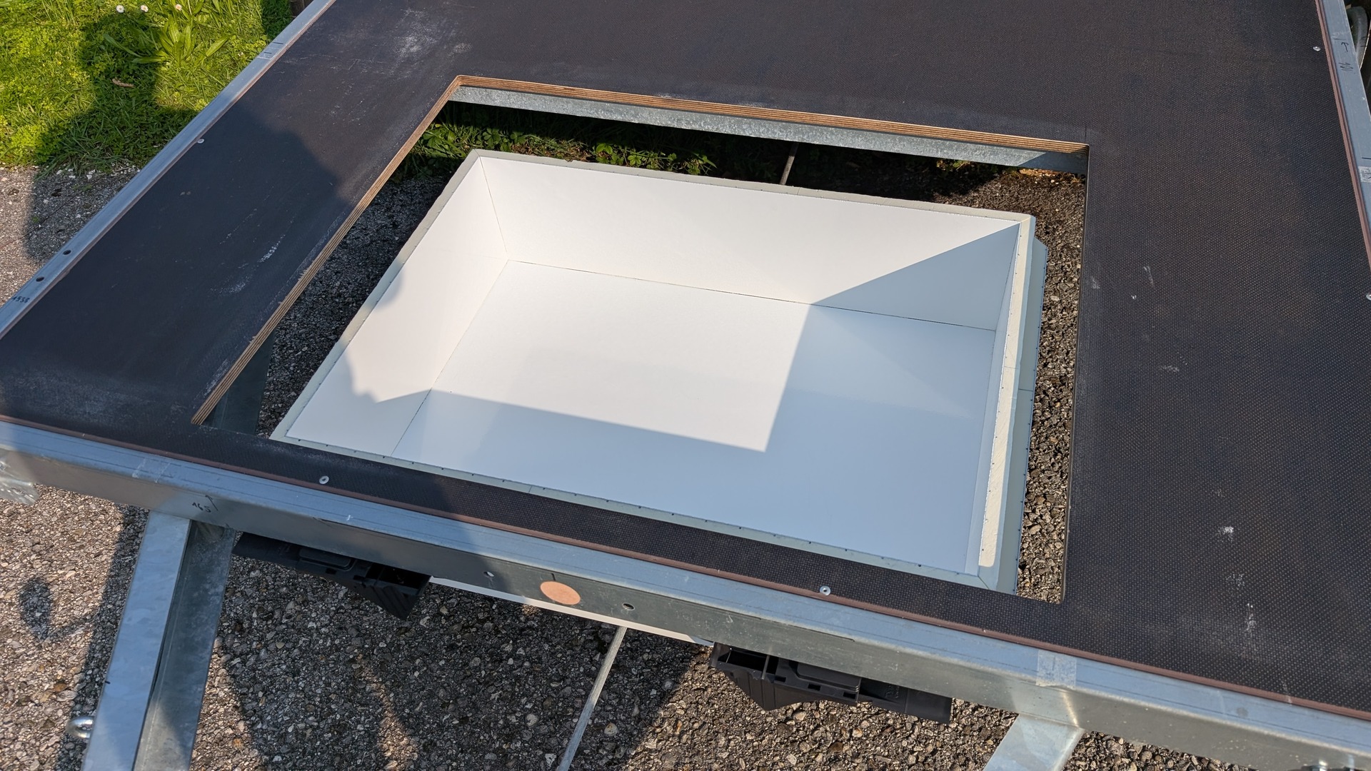 Innen kommen noch Winkel rein und die Box wird dann mit Stufenfalz in den 6cm Boden von unten eingelassen.