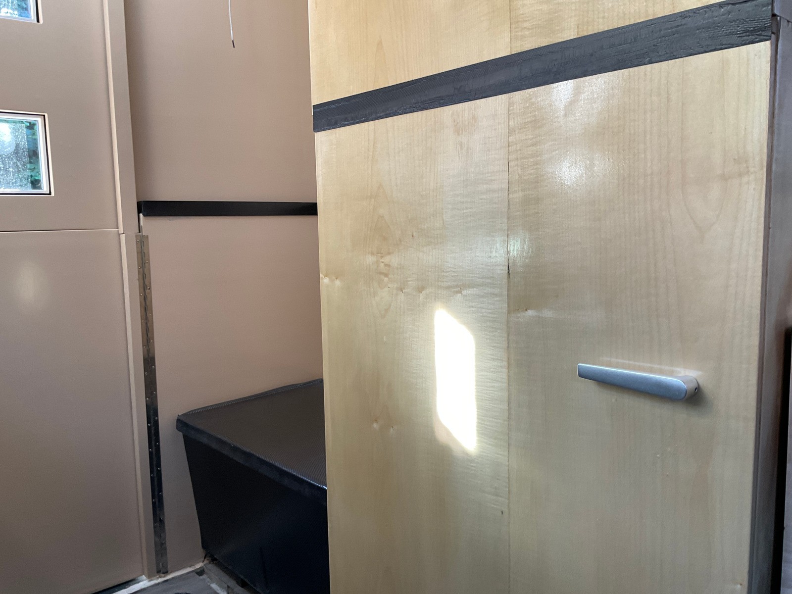 Die Schranktüren haben ein H-Profil zur Verbindung bekommen, was in Fahrstellung herausgezogen werden muss. Den Türgriff habe ich voreilig eingebaut. Zum Verriegeln des Schranks ist er in Ordnung, nur wollte ich auch eine Lösung zum Fixieren an der Küchenarbeitsplatte, wenn ich mit der Tür das Bad verschliessen will. Das muss ich wohl in einem wachen Zustand nochmal überdenken.