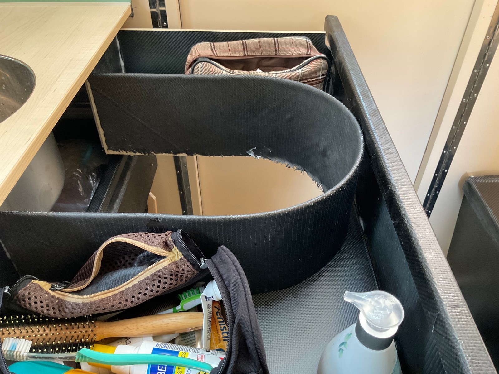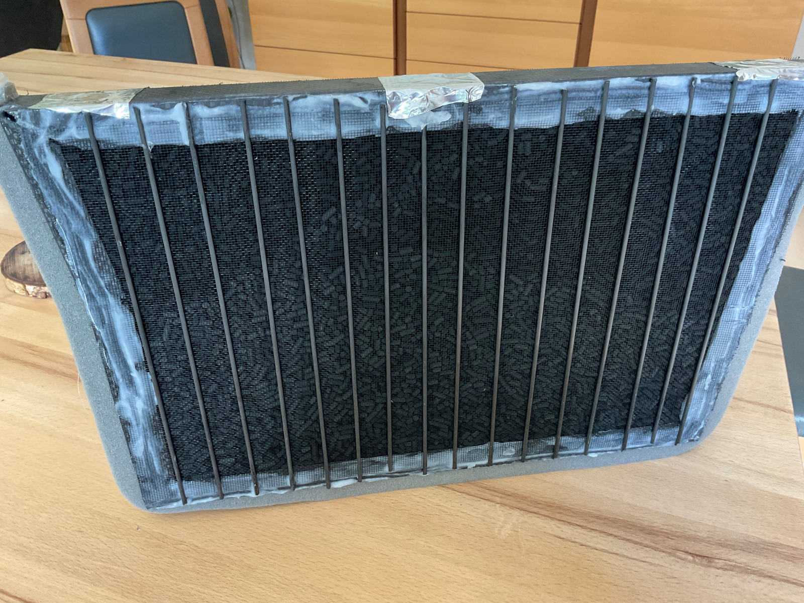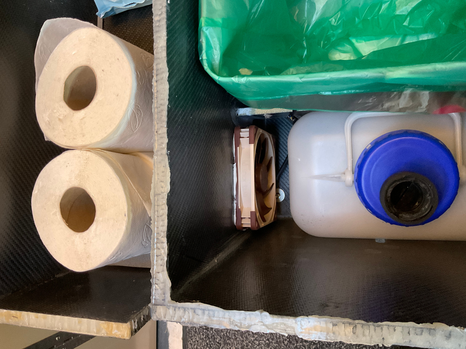 Da wir ja im Prinzip in einem Badezimmer wohnnen, gibt es jetzt eine Geruchsabsaugung mit Aktivkohlefilter. Der Rahmen wurde entsprechend einer Schablone zusammengeklebt, mit Fliegengitter und günstig erstandenen Kohlefaserstäben beklebt und mit Aktivkohlepellets gefüllt. 2,2 kg wiegt der Filter, Aktivkohle ist halt keine Kohlefaser. Der Filter wurde mit komprimiertem Schaumstoffband luftdicht in das Seitenfach der Toilette eingesetzt und das Fach mit einem Deckel geschlossen. Klopapier passt dann noch darüber.