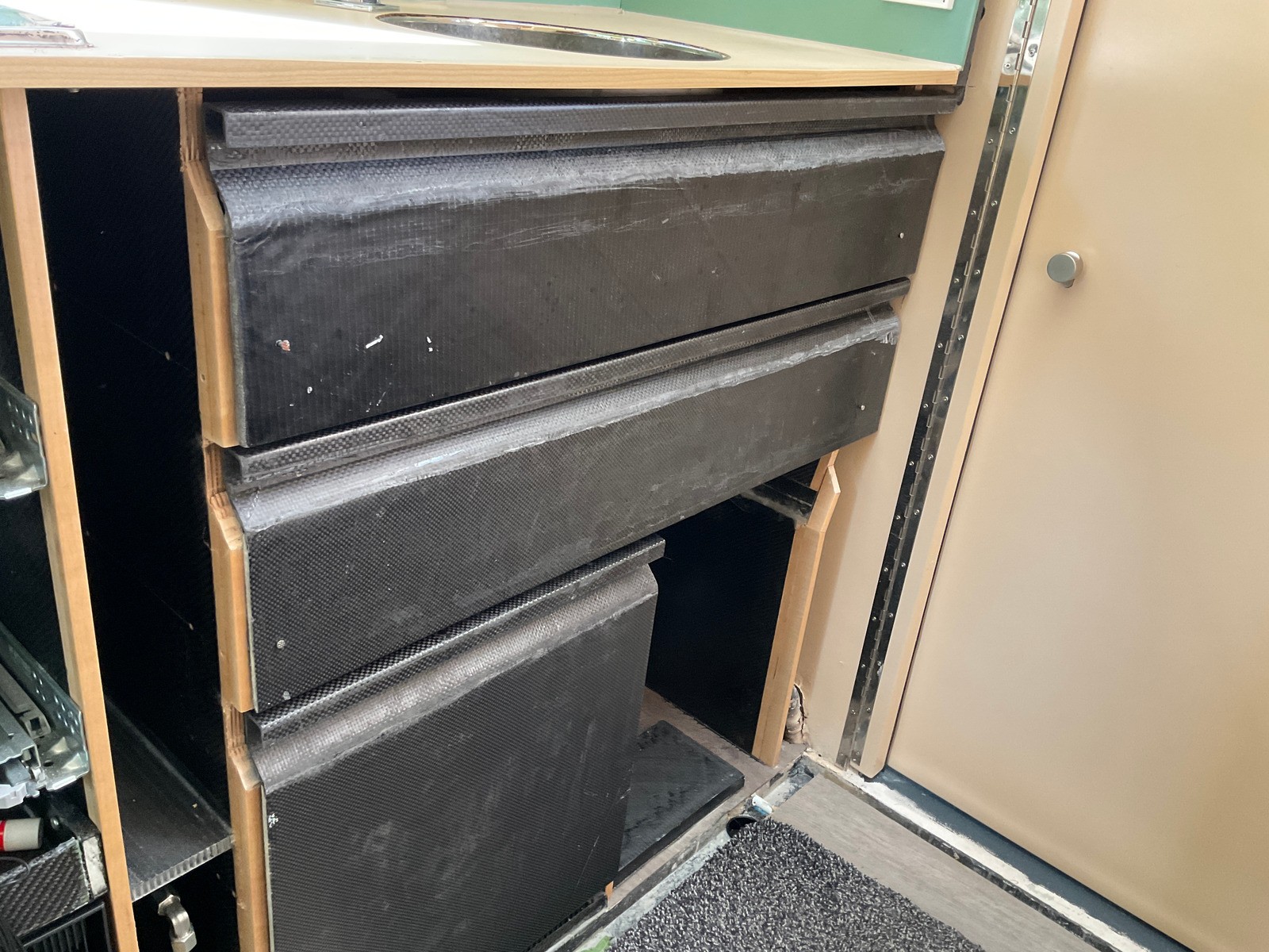 Dann sind die ersten Schubladen entstanden, natürlich die kompliziertesten zuerst. Mit einer Form habe ich Griffleisten gepresst, an Schaumplatten geklebt und überlaminiert. Die Griffleisten sind oben nach aussen geneigt, so das heruntertropfendes Wasser nicht in die Schubladen gelangt.