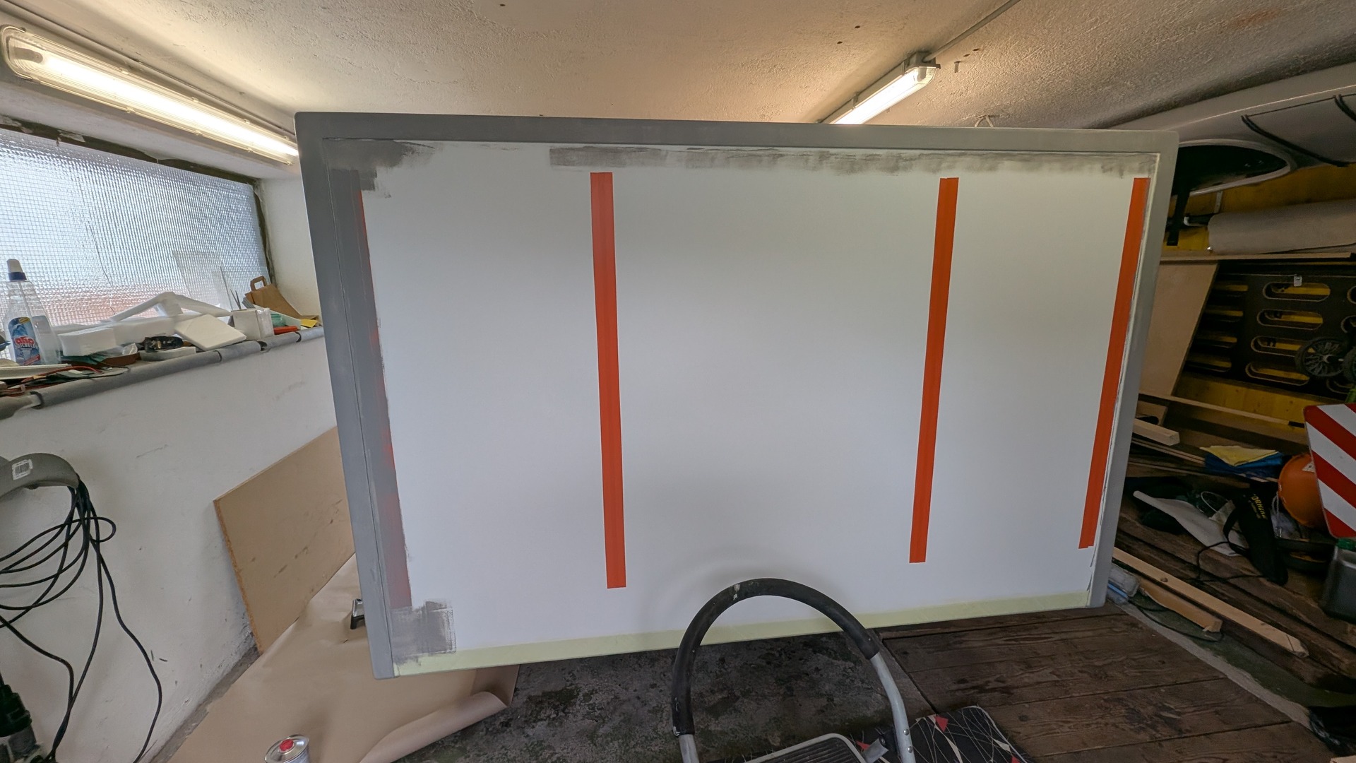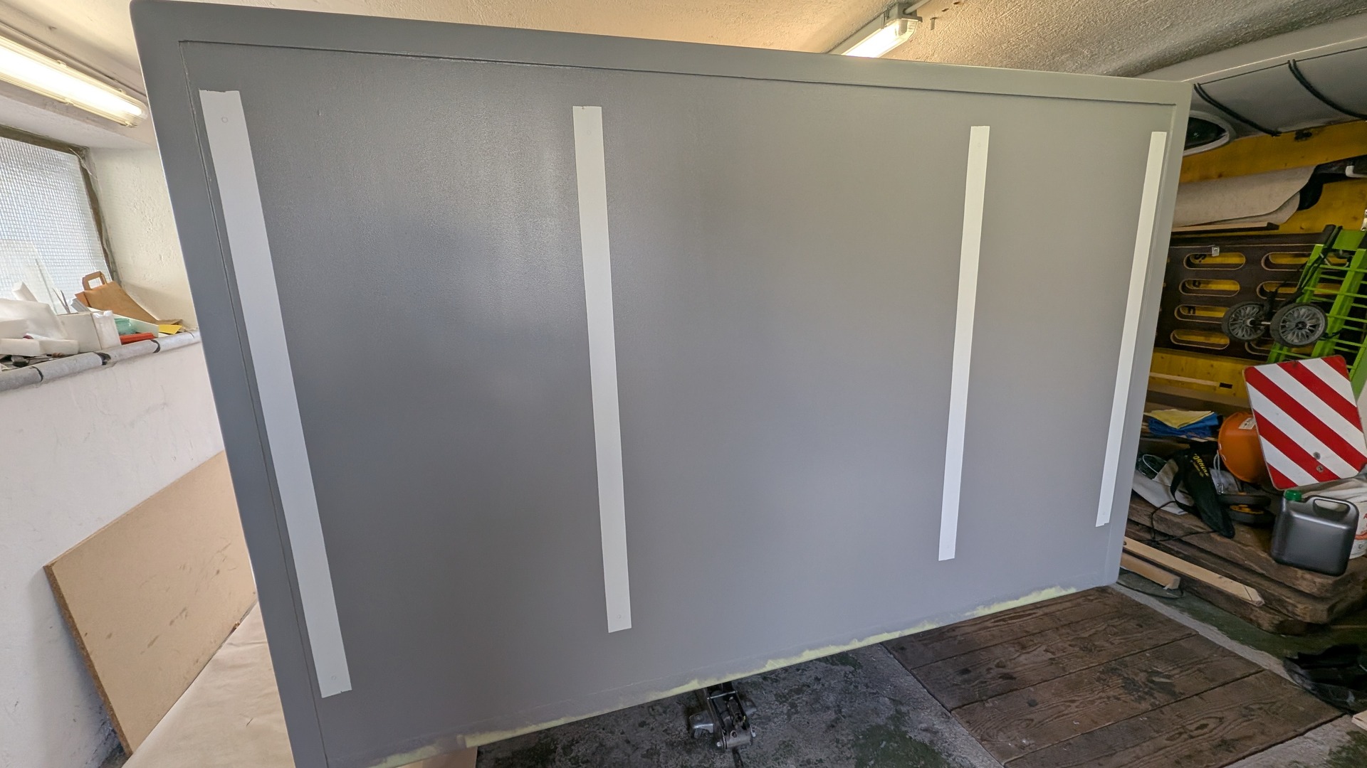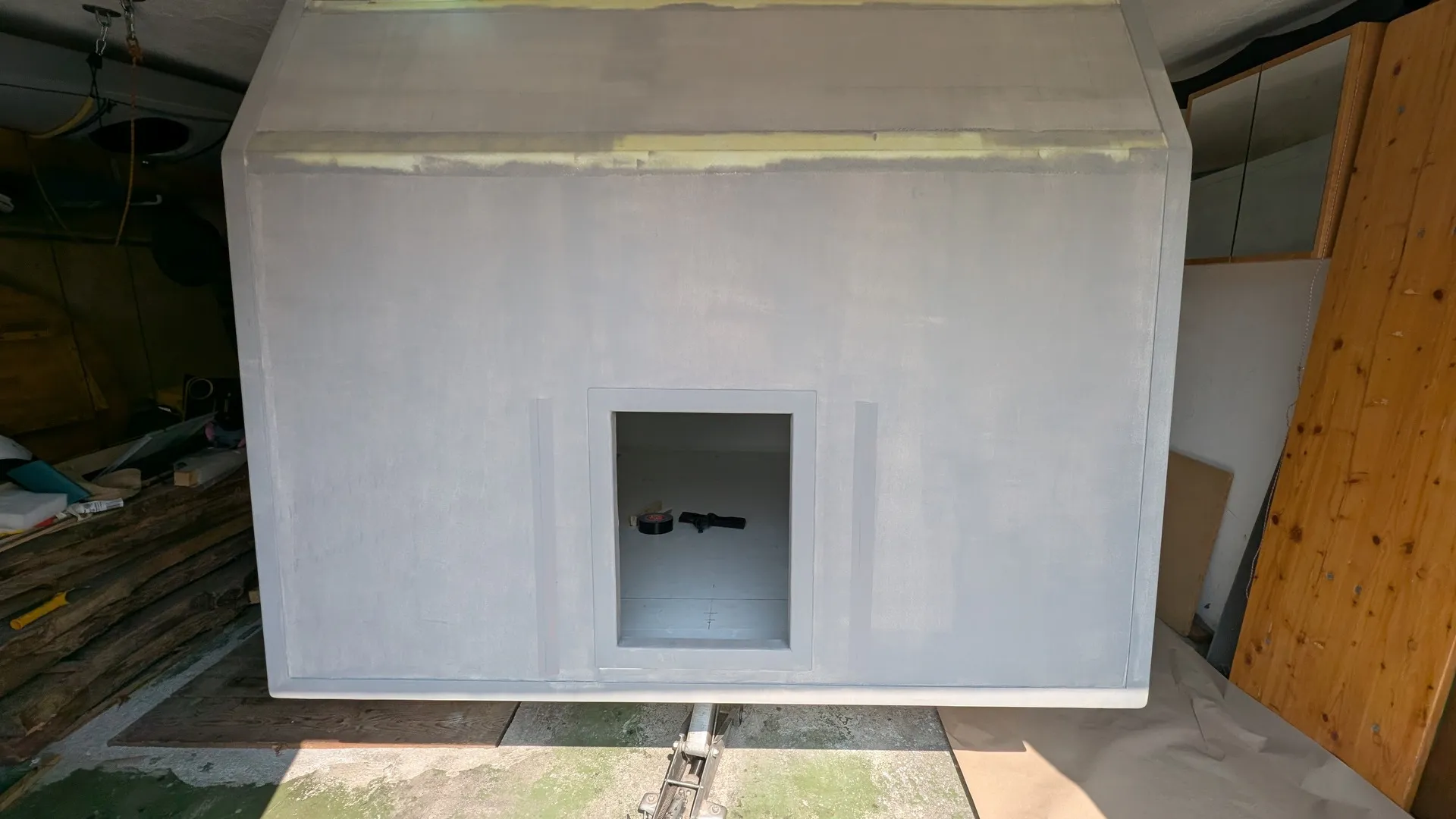 Inzwischen habe ich die Box gespachtelt, geschliffen (180) und mit Mipa Protector RAL 7004 mit der Walze lackiert.