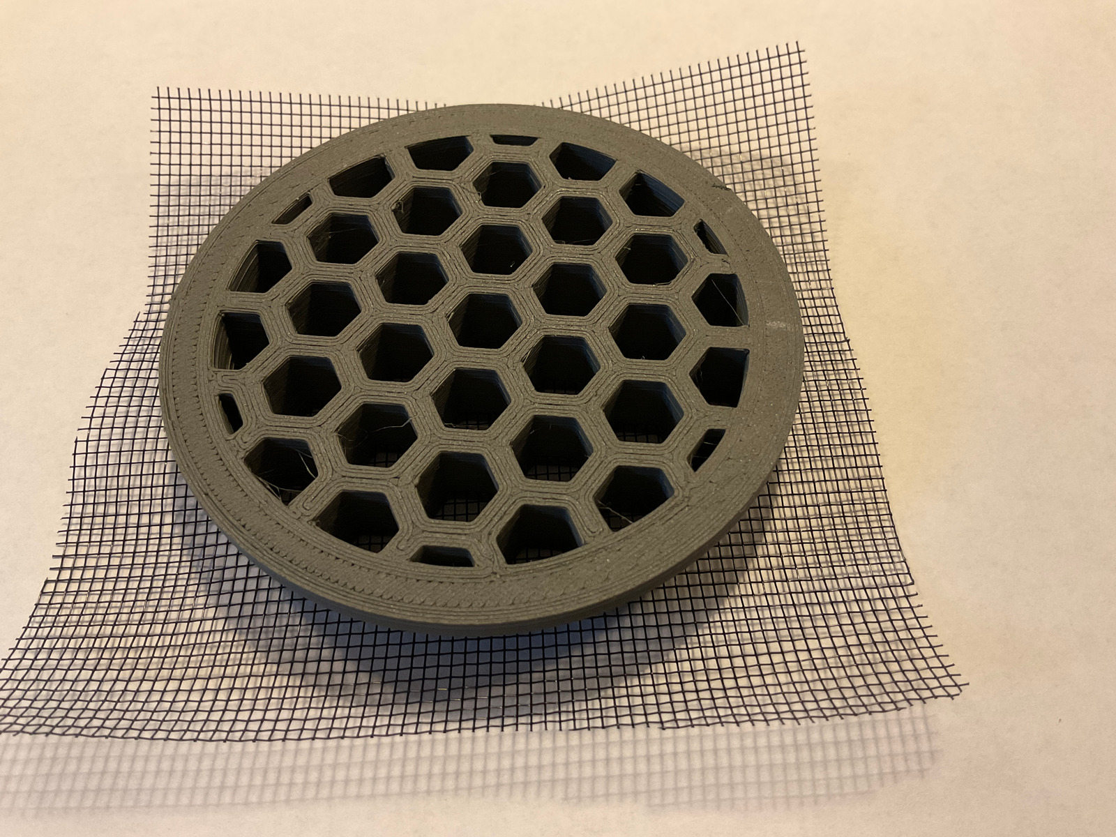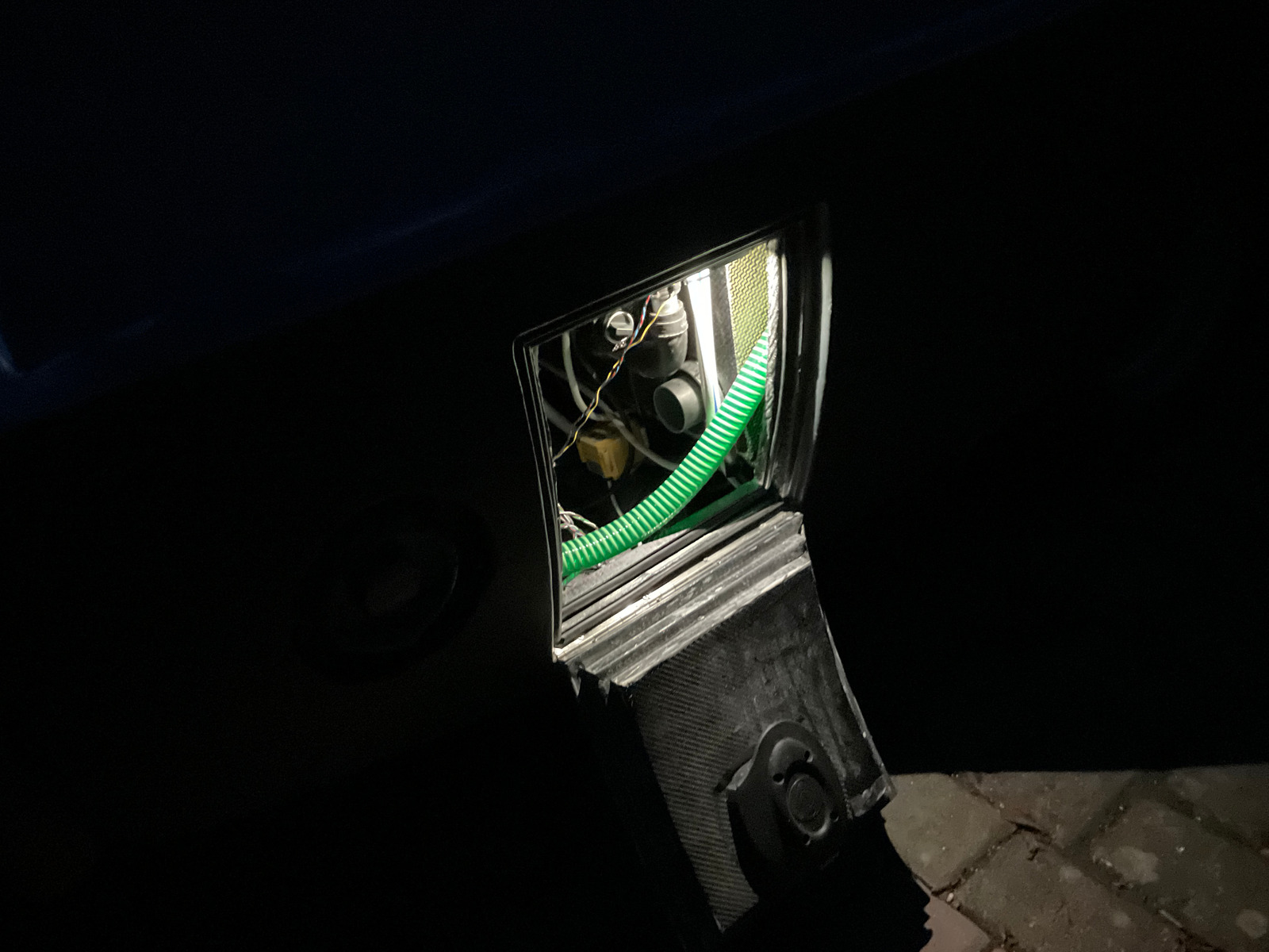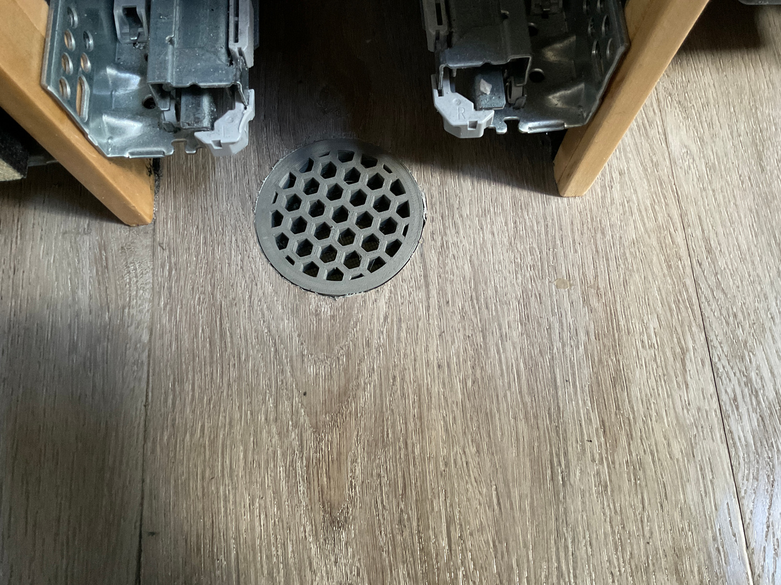 Mein Sohn hat wieder gedruckt. Ein Lüftungsgitter mit den vorgeschriebenen 15cm2 Lüftungsquerschnitt im Boden. Das Gitter verjüngt sich nach unten, hat ein während des Drucks eingelegtes Fliegengitter und steht auf einem Trichter, der sich auf wieder 15cm2 (4,5cm Durchmesser) verjüngt und im Kotflügel herauskommt. Einen besseren Platz habe ich nicht gefunden, entweder decken Möbel eine Öffnung ab oder die Staukästen und Tanks verhindern einen direkten Durchgang nach draussen.