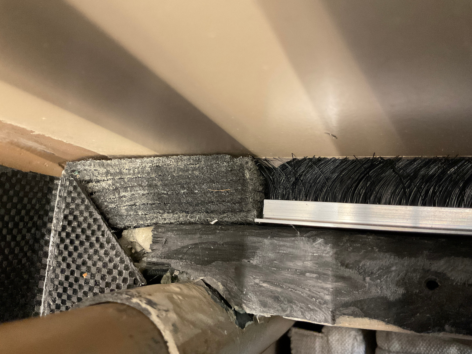 Nochmal ein Nachtrag zu der Hubdachabdichtung. Die Schaumstoffstreifen und Kugelrollen hat der Fuso wieder ausgespuckt, nun gibt es Bürstendichtungen. Auf dem Foto sieht man auch die Deckelführung mit einem Stapel Filzfussbodenstücken.