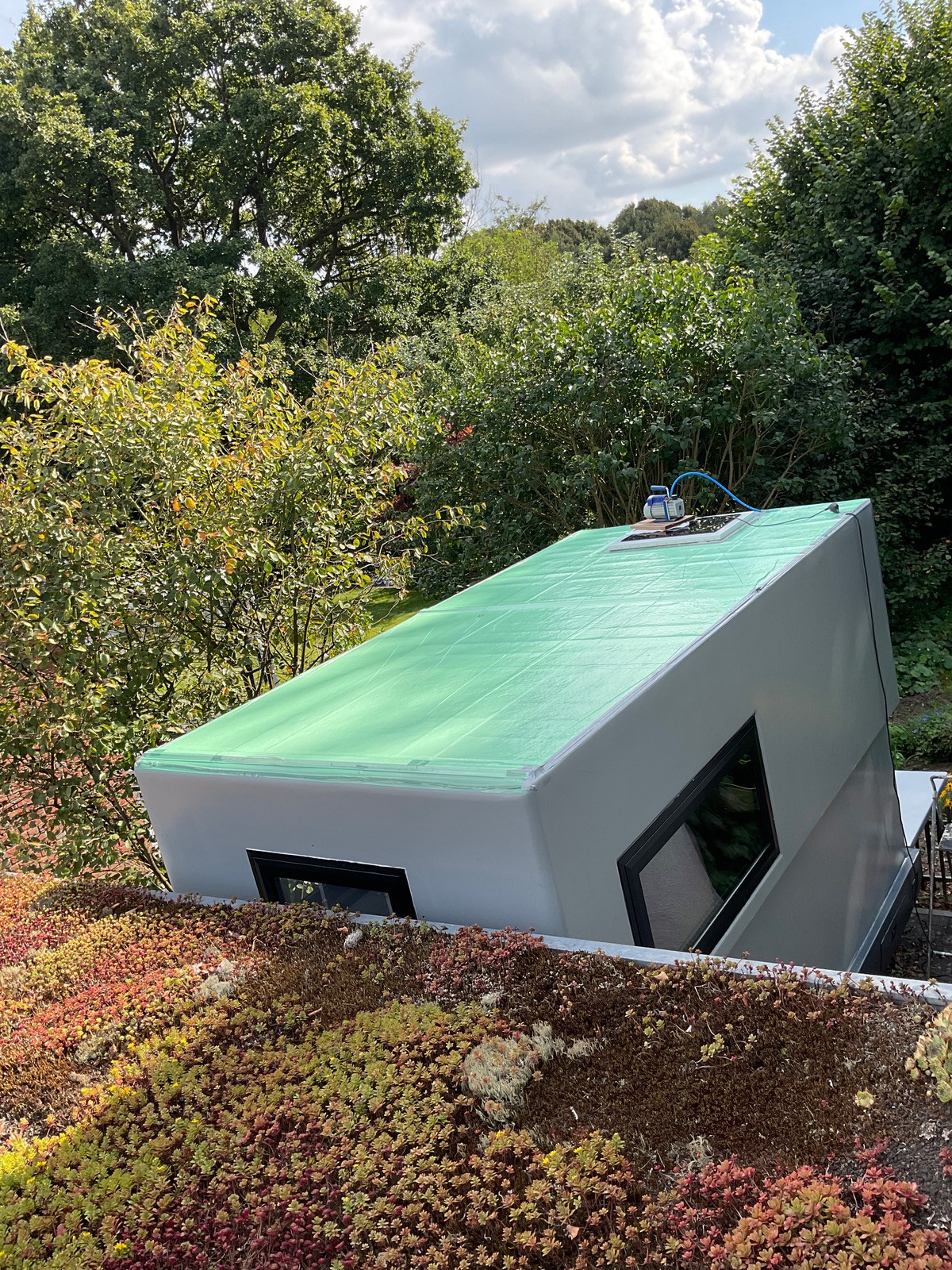 Ich bin immer noch unzufrieden mit dem gelegentlichen Wassereintritt durch die delaminierten Solarzellen. Nach einer wirren Idee habe ich das Dach mit Folie abgedeckt und die Vakuumpumpe angeschlossen. Es ist leider nichts spektakuläres passiert.