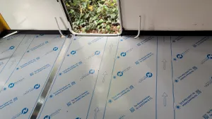 Zur Wärmeverteilung, Dampfsperre und Trittlastverteilung dienen 1 mm Aluplatten, wieder mit Übermaß und aktuell nicht verklebt.