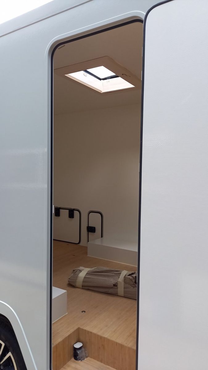 Die Außenhaut ist 0,8mm High-Impact GFL und darunter eine 3mm Wabenplatte, dann 37mm Schaum und wieder 0,8mm GFK innen.