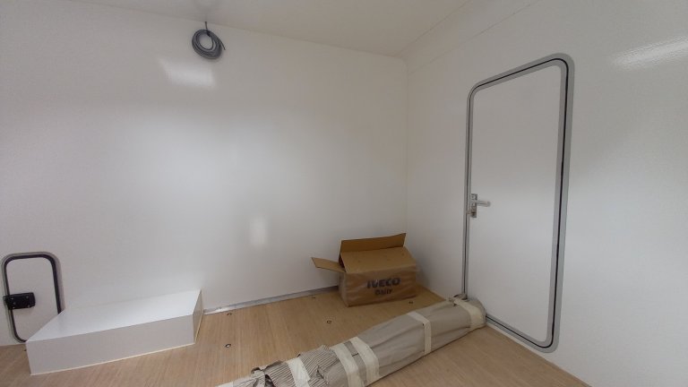 Die Außenhaut ist 0,8mm High-Impact GFL und darunter eine 3mm Wabenplatte, dann 37mm Schaum und wieder 0,8mm GFK innen.