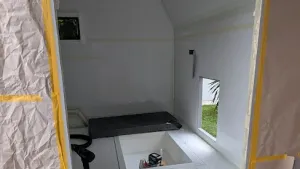 Die Duschwanne aka Stehhöhenerweiterung nach unten habe ich von oben mit Winkeln einlaminiert, jetzt fehlt noch von