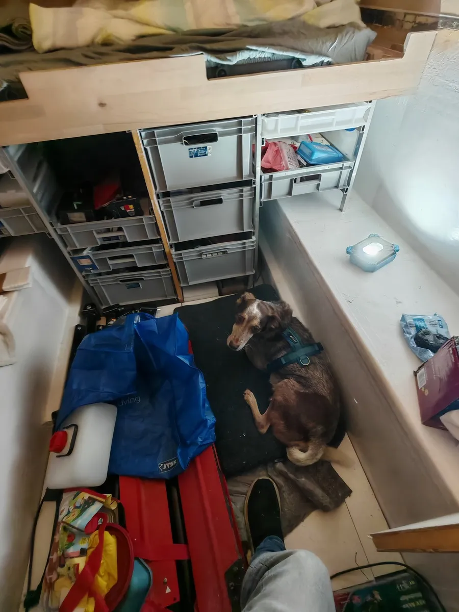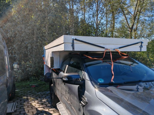 Dann waren noch Kleinigkeiten, die ich erwartet habe. Die Boxen innen müssen gesichert werden,.weil rutsch teilweise. Und die Stützen und Böcke ohne Sicherung in der Kabine sind auch nicht wild aber vom Lärm von hinten nervig. Böcke will ich in der Pritsche sichern und die Stützen unden Wangen der Kabine.