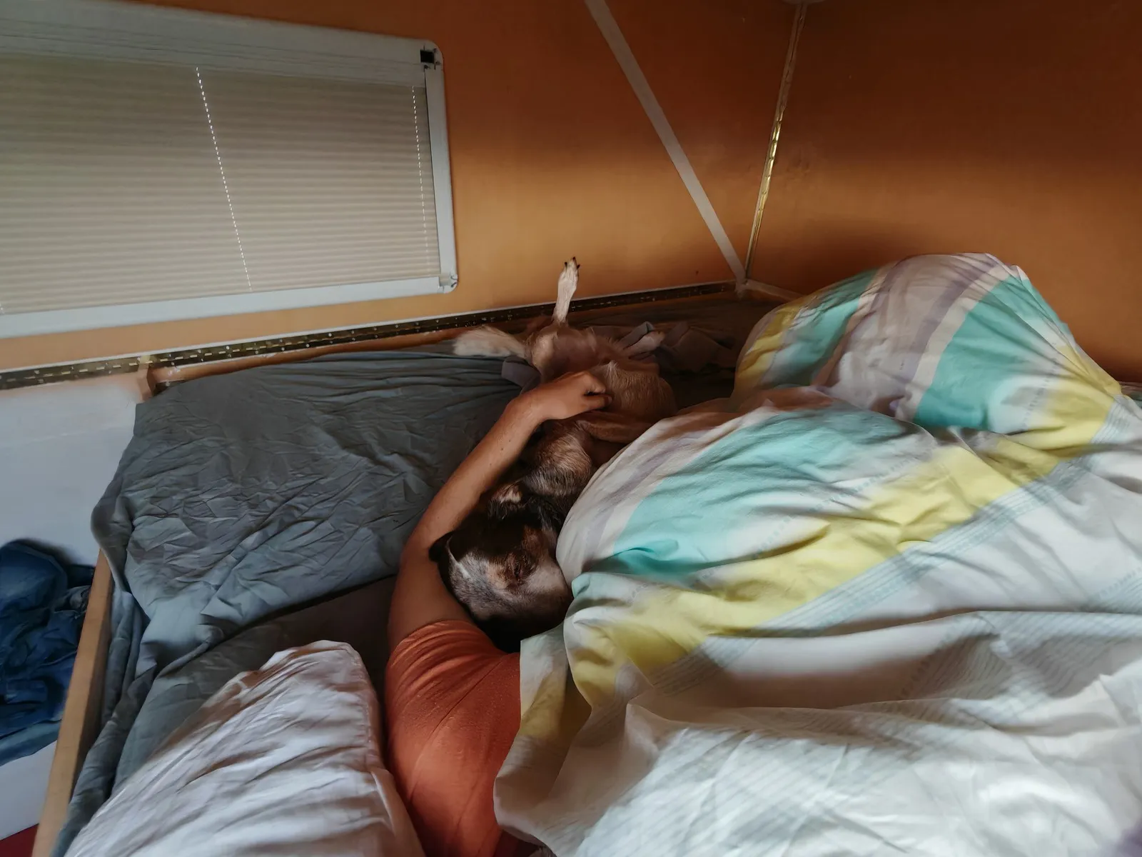 Am Samstag haben wir einen neuen ruhigen Stellplatz mit Strom gewählt. Dort kam ordentlich kühler Wind am Abend auf. Da die Ritze oben am Dach noch keine Dichtung hat,.zog es dort.heftig rein und der Heizwürfel war etwas auf verlorenen Posten. Etwas wärmer schon, aber nicht die erwartete Erwärmung. Also Dichtung oben muss ich definitiv machen. Dort zieht der Zug die Wärme direkt wieder aus der Kabine. Unter wäre es vermutlich nicht so schlimm, da Wärme ja bekanntlich nach oben zieht.