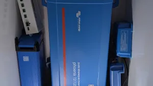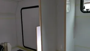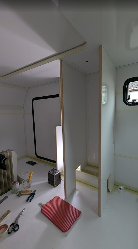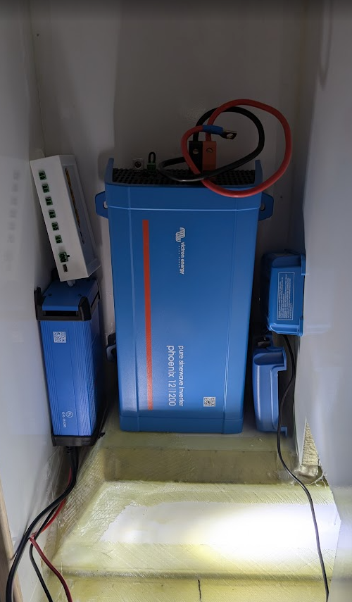 Mal die Elektrik positioniert, das wird die 2. Ebene, davor sollte noch der Sicherungsblock und der Vanpi kommen, hier sieht man von links nach rechts den Dimmy von VanPi, darunter den 230V Lader,daneben den Inverter , wieder daneben den Solarregler oben ,den Booster unten:![]()