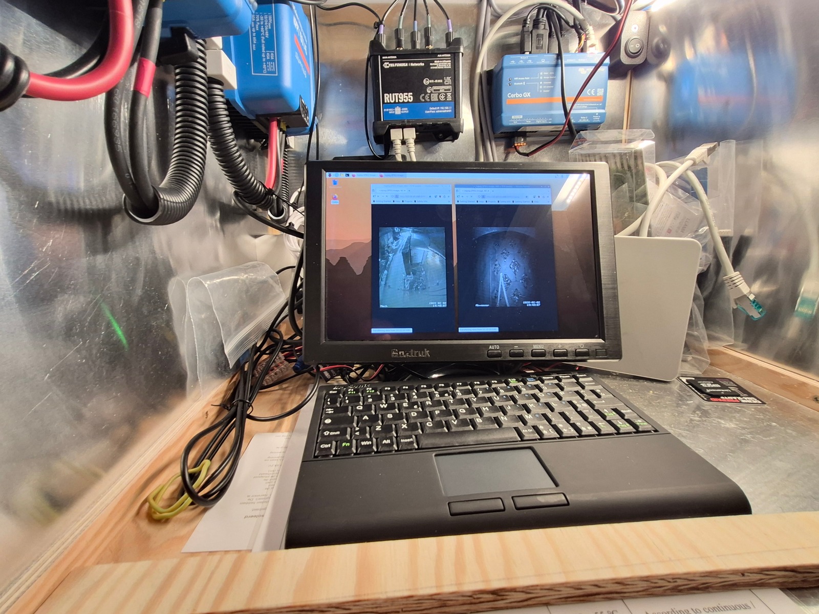 Die Elektroecke über der Garderobe hat Zuwachs bekommen ( ein Pi5 mit Videograbbern) für Heckkamera und Kamera am Grauwasserauslauf.