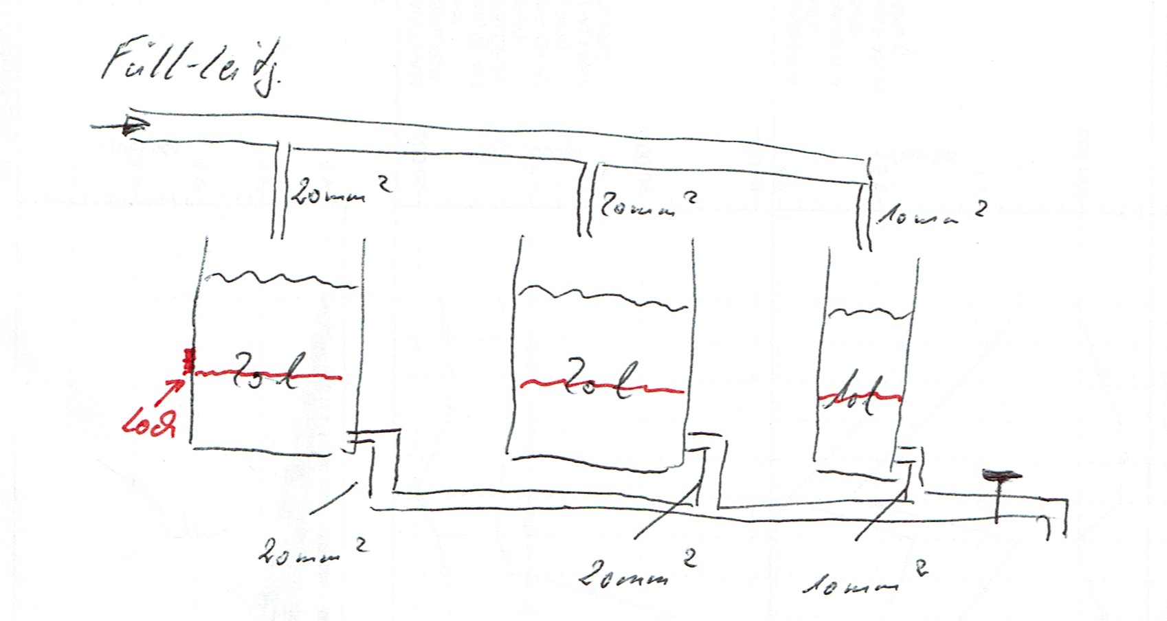 Schicke ich hierbei Wasser in die Füllleitung, so kommt durch den doppelten Querschnitt bei den 20-Liter-Eimern doppelt soviel Wasser in diese Eimer wie in den 10-Liter Eimer. Genauso ist es mit dem Ablauf: bei den 20-Liter-Eimern geht pro Zeiteinheit doppelt soviel Wasser weg wie bei dem 10-Liter Eimer. Das Wasserniveau bleibt also in allen Eimern gleich. Soviel zum optimalen Fall mehrerer einwandfreier Eimer und Schläuche.