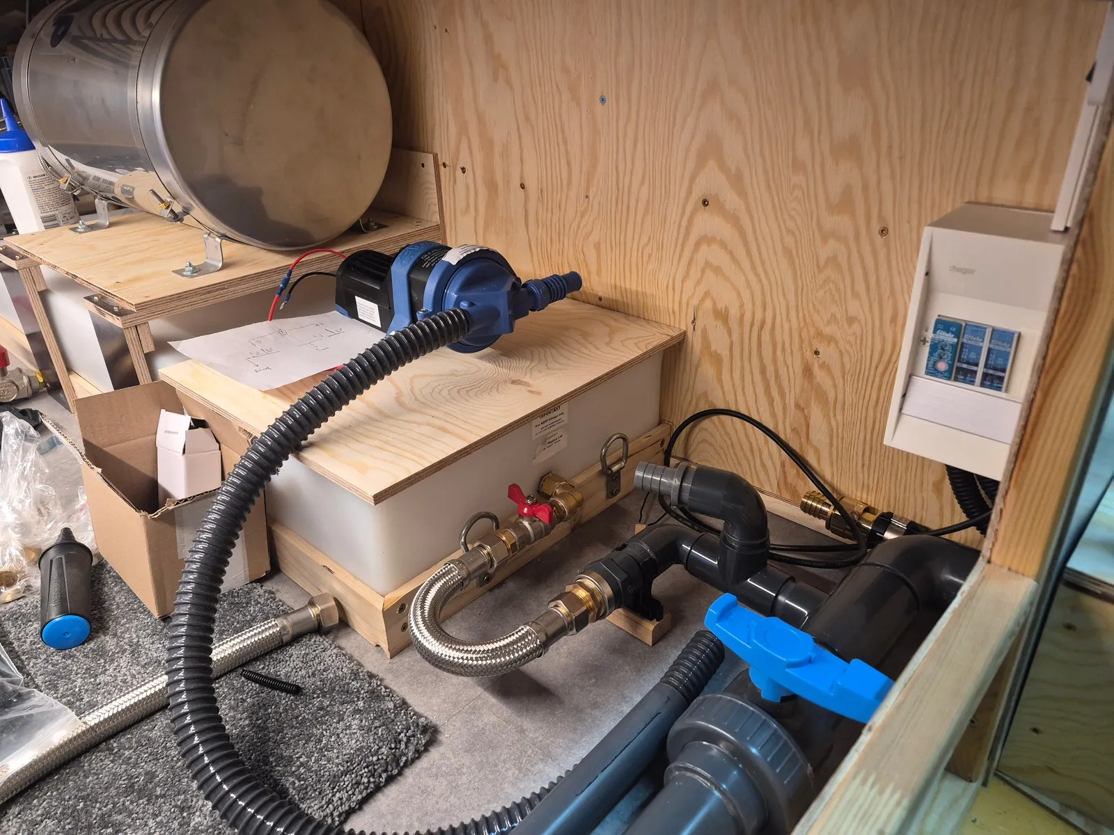 Auf dem rechten Bild ist die Hahnkombination zu sehen, mit der zwischen umpumpen aus dem Zwischentank in den Grauwassertank und dem Ansaugen für die Grauwassertankentleerung umgestellt wird. Dies kommt noch "Huckepack" über die Membranpumpe. ![]()