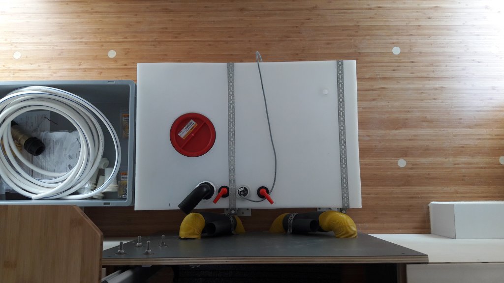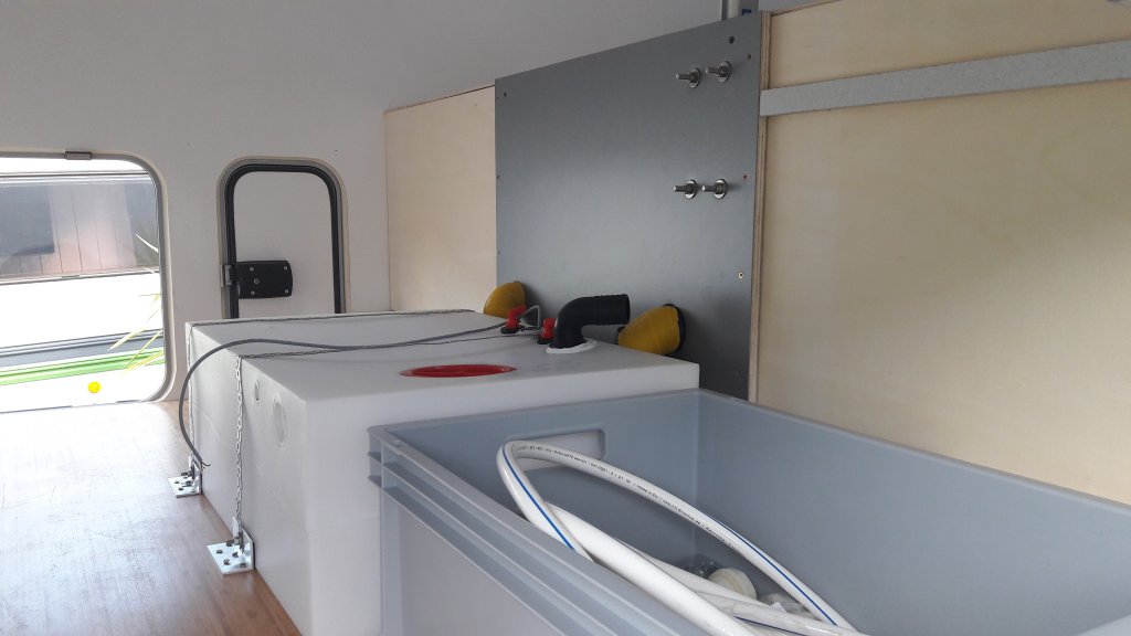Direkt mal eine Frage, weil deine Tankanschlüsse so schön sichtbar sind: Wie ist die Entnahme für die (ich vermute) Druckwasserpumpe im Tank gelöst? Hast du da ein festes Saugrohr bis knapp über den Boden oder hängt ein Schlauch (mit Gewicht?) im Tank?