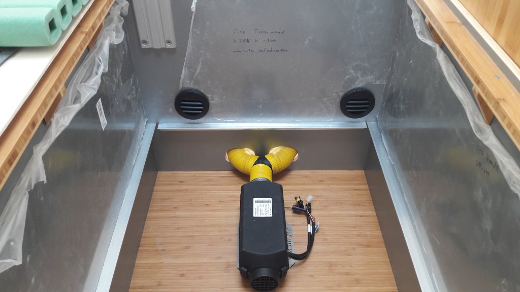 Heute dann die Autotherm Heizung mechanisch eingebaut mit der Warmluftführung in über meine selbst gedruckten 35mm Abzweiger für die Betthinterlüftung.