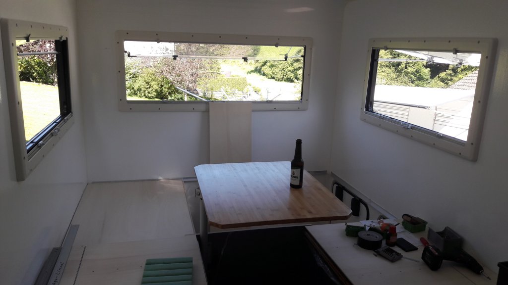 Den Vormittag hab ich damit verbracht eine Airlineschiene für die Solarbefestigung aufs Dach zu kleben. Damit gehts dann morgen weiter..
