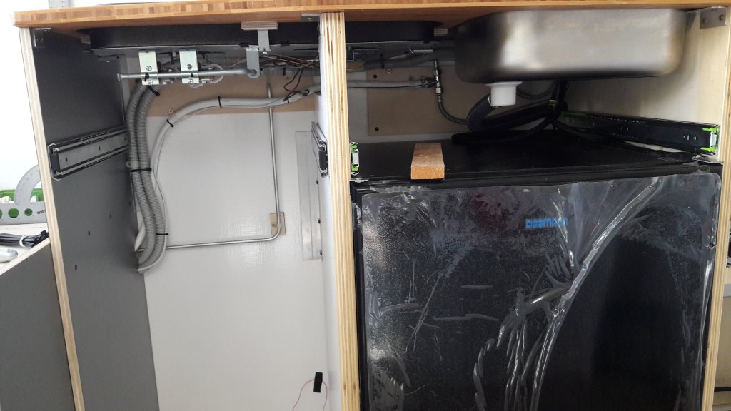 Also mal die Küchenarbeitsplatte fertig eingebaut und vorher noch ein Paar Kabel verlegt, solange man noch gut dran kommt.