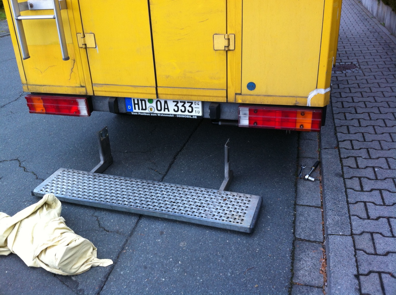 Zum Einbau musste nur die Heckstufe abgenommen werden, die mit jeweils vier M12 Schrauben an den Längsträgern verschraubt ist. Anschließend werden die gleichen Löcher zur Montage der Anhängerkupplung genutzt. Die M12x1,5×90 Schrauben mit 10.9 Festigkeit habe ich leider nirgends auftreiben können als in der Sternenapotheke. Sie haben die Teilenummer 304014010009, die passenden Muttern haben die Teilenummer 910113010001. Die AHK habe ich netterweise von Mike, auch einem Paketkoffer-Fahrer, geschenkt bekommen. Zusätzlich zu den acht Schrauben und Muttern benötigt man aber noch je eine Unterlegplatte: