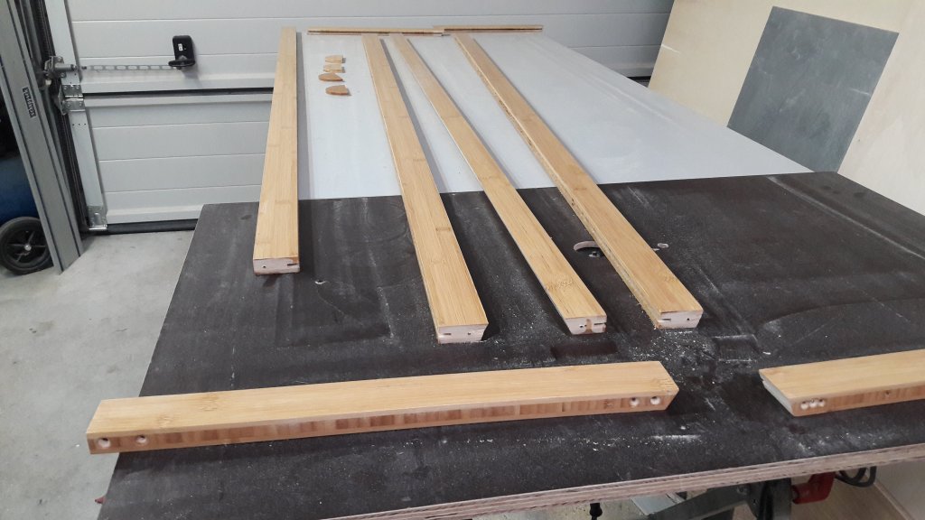 Die Rahmen sind innen längs geschlitzt mit der Kreissäge für die Füllung mit Alu-Dibondplatten.
