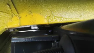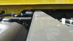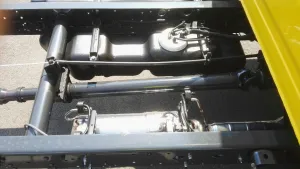 Bild 2: Nahaufnahme des Dämpfers der hinten links unter dem Fahrerhaus sitzt