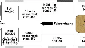 5. Nun meine Hauptfrage, die Gewichtsverteilung. Den Grundriss habe ich schon ausgiebig überdacht, genug Platz im Bad und Längsbett ist ein Muss, Küche nicht unter 1,5m, in der Sitzecke auch mal etwas Platz zum lümmeln. Daraus ergibt sich die Länge von 6m. Das Bad habe ich zwecks besserer Gewichtsverteilung von der Mitte ganz nach vorne gepackt. (Was ich mir ausgedacht habe entspricht zufällig recht genau dem KABE ROYAL 630 TDL KS) Einiges habe ich schon eingezeichnet irgendwo müssen noch ein paar Batterien hin. Noch mal komplizierter oder evtl. gar nicht realisierbar wird es natürlich durch die unterschiedlichen gewünschten Einsatzmöglichkeiten. Auf den Anhänger könnte ich vermutlich zu Not verzichten.