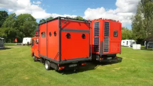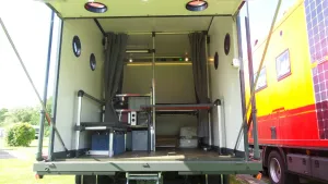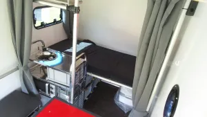 Die Inneneinrichtung ist etwas spartanischer, als beim Shelter oder beim Großen, weil das ja nur ne "zusätzliche" Wohneinrichtung ist, z.B. auf Festivals oder beim Einsatz im "Outback". Daher auch etwas strapazierfähiger. Alles ist hochklappbar, so dass man es gut reinigen kann, oder auch ne große Ladefläche hat. Und es kann auch vor Ort gebastelt und gewerkelt werden, weil da alles ziemlich unempfindlich ist. Für den gemütlicheren Teil geht's dann in den Shelter.