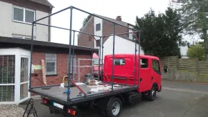 Das ist der erste Schritt, der äußere Rohrrahmen. Der wird fest mit der Pritsche verschraubt, und der Koffer wird lose da rein geschoben. Bei Torsionen der Pritsche kann der Koffer sich dann bewegen, ohne sich zu verziehen. Gummipuffer rundum halten ihn zentriert. Das ist das dünne Rohrgestänge in dem Bild rund um den Koffer: