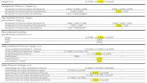 Korrektur: Das vorstehend gezeichnete Fahrzeug ist der 3,4m Radstand. Unser Fahrzeug haben wir gelb markiert. Das sind die lieferbaren Varianten: