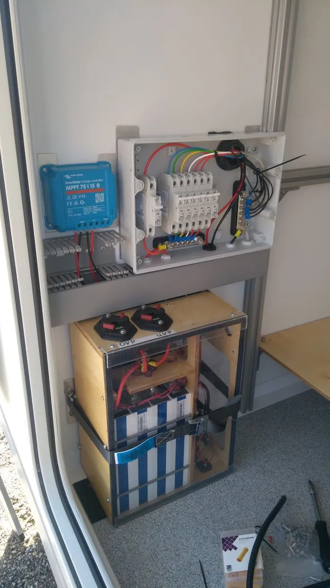 So, wieder einiges geschafft. Die Elektrik ist fast fertig. Die Batterie steht mit Solarladeregler und Sicherungen in der Frontgarage.