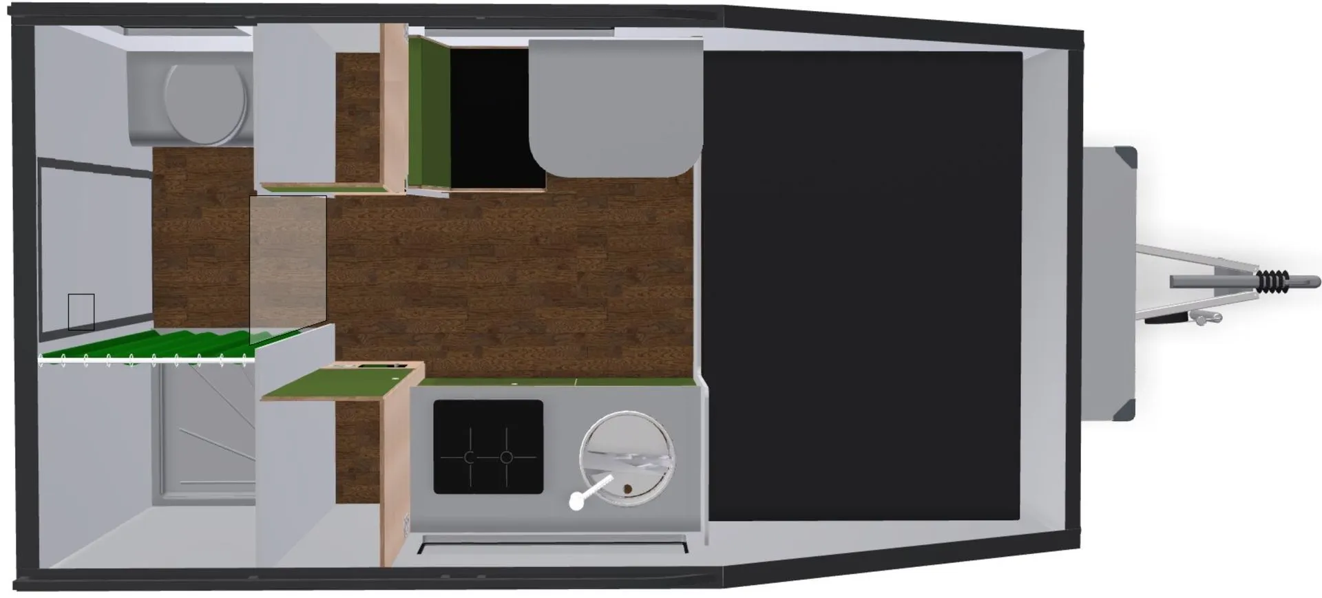 Die Heckschräge habe ich inzwischen aufgegeben. Durch die verhältnismäßig großen Räder und die relativ kompakten Abmessungen sollten unebene Wiesen trotzdem kein Problem darstellen. Dem Grundriss tut das gut, da viel mehr Nutzfläche bleibt. Der Einstieg an der Rückwand tut sein übriges, da so keine Ecken verschwendet werden. So haben auf knapp 4m Länge und 2m Breite ein Doppelbett, eine Sitzecke, eine Küche, ein Schrank und eine großzügige Nasszelle mit WC und Dusche Platz.