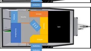Stauraum bis ins letzte Eck brauch ich nicht, auf unserem Trip mit dem VW-Bus war alles bis auf die Kühlbox unter dem Bett, das hat uns bestens gereicht. Unter dem Bett ist sowieso Platz ohne Ende, die Sitzbänke können auch als Truhen ausgeführt werden, das gibt nochmal Volumen. Die komplette Dinette ist übrigens auf einem Podest, um nicht mit dem Radkasten in die Quere zu kommen. Dort soll auch der Wassertank untergebracht werden. Die restliche Technik unter dem Bett und im unteren Teil des Schranks.