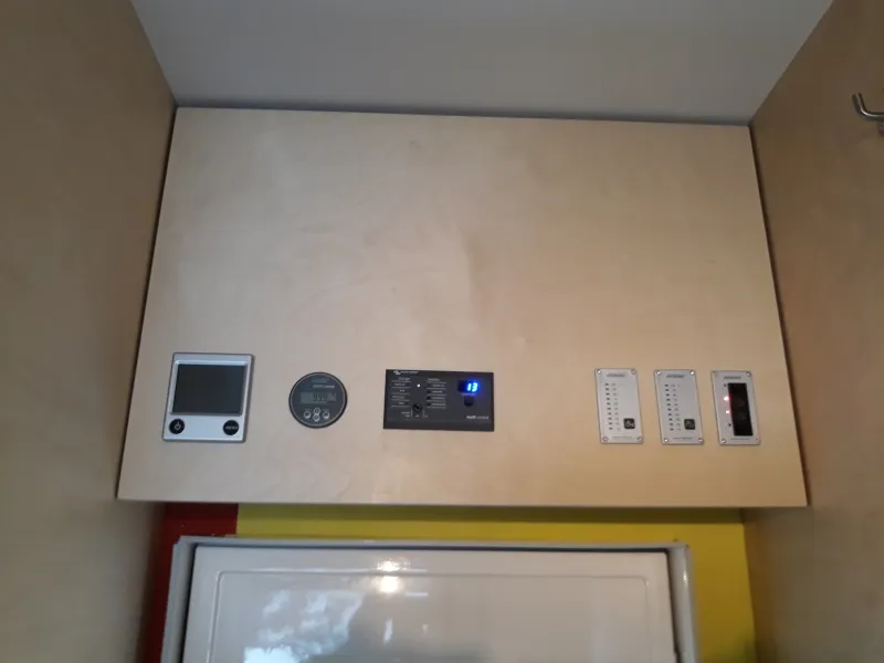 Die linke Armatur ist für das Stromaggregat. Rechts ist oben ein billiges Volt/Amperemeter um den Akkuzustand zu erahnen. Daneben die Anzeige von Votronic für den/die Wassertank(s). Es sind zwei Tanks je 100 Liter. Da entfällt das umrechnen von % in l.