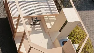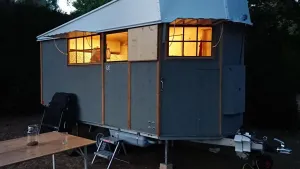 Der Aufbau besteht aus schmalen, gefälzten Rahmen aus massiver Eiche, in die zur Aussteifung der Wände 12 mm Fichte 3-Schichtplatten geschraubt sind. Der Boden ist aus 19 mm 3-Schichtplatte gefertigt und liegt hinterlüftet mittels Eiche Leisten auf dem Aluanhänger auf, dadurch ist er gegen Spritzwasser von unten dauerhaft geschützt. Das Klappdach besteht aus einem Rahmen aus 3-S Platte, 5 mm Sperrholz und aussenseitig 0,8 mm weißem Aluminiumblech. Das Dch wird mit einer 50 Jahre alten Handbohrmaschiene und Gewindestange mühelos auf- und zu gekurbelt. Die Kabine ist nicht zusätzlich isoliert, für echtes Wintercamping also nicht geeignet. Aber mit der 2 KW Trumaheizung wird es bis 0 Grad Aussentemperatur mollig warm. Das Holz ist innen nur geölt, kann also Feuchte aufnehmen und wieder abgeben, Schwitzwasser tritt noch nicht einmal an den Echtglas Scheiben auf. Nachts klappen wir die Schlagläden herunter, die dienen als Sicht- und zusätzlicher Wärmeschutz. Bei der Bettkonstruktion haben wir uns eine
