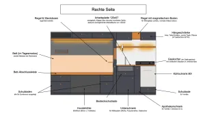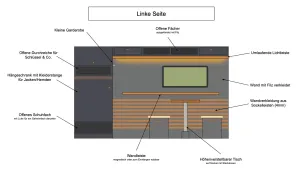 So sieht es aus, wenn man nach dem Eintreten nach links guckt. Der Hochschrank am Eingang hat auf Halshöhe ein Fach für Schlüssel/Sonnenbrille & Co, um diese nach dem Reingehen schnell und an einem richtige Platz abzulegen. Außerdem ein offenes Schuhfach unten, welches eine Luke zu einem Geheimfach darunter (bspw. fürs Macbook) hat. In der Mitte ist ein Hängeschrank, oben ein Fach für die Kulturbeutel (u.a.) um diese morgens/abends schnell zur Hand zu haben.