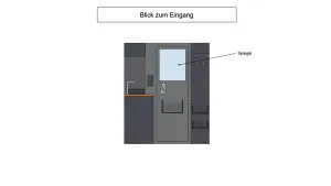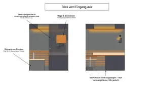 So sieht das Ganze vom Eingang aus kommend aus. Links mit halbtransparenter Trennwand (Versorgungsschacht), welche ein Regal in Richtung Küche vorsieht (für Öl/Essig zB...) und eine etwas nach innen versetze Stirnwand, um z.B. Haken für Handtücher unterzubringen, ohne dass dieses dann im Weg wäre.