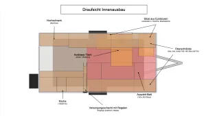 So sieht das Ganze von der Aufteilung aus, innen und im Keller. Der Keller selbst hat ein großes Fach am Eingang (Campingstühle usw..), zwei weitere unter der Sitzgruppe (freie Verfügung, bspw. Hundefutter, Wanderschuhe..) sowie ein Fach für den Wassertank (rund 70l) und eines für Batterie/Steuerungstechnik (unter der "Hundehöhle), die gestrichelten Linien sind die jeweiligen Klappenausschnitte, da die Fächer tlw. unter Möbeln sein werden. Die zwei Fächer unter der Sitzgruppe bestehen aus je einer mit Filz ausgekleideten Eurobox, die von unten an die Bodenplatte befestigt wird. Die anderen Boxen bleiben offen und werden durch das Gefache begrenzt.