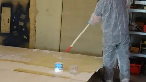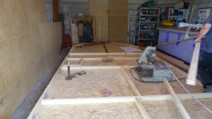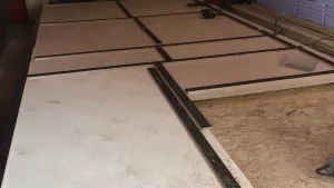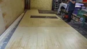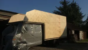 Zur Frage mit den OSB Platten...., um Gottes Willen, niemals würde ich OSB Platten im Reisemobil verarbeiten! Die OSB Platten welche auf den Bildern zu sehen sind ist die Arbeitsplattform in unserer Halle. Ich hab Doppel T- Träger aus Holz ( aus dem Baubereich zur Einschalung von Decken) auf dem Hallenboden waagerecht ausgerichtet und diese mit 25 mm starken OSB Platten beplankt. So ist praktisch ein großer „Tanzboden“ der komplett eben war entstanden. Diese Fläche habe ich genutzt um die Wand und Deckenelemente für den Kofferausbau zu fertigen. Ich hab den Rahmen / Gerüst der Wände und Decke auf dieser Fläche zusammengesetzt und seitlich mit Holzklötzen fixiert ( damit es nicht verrutschen kann ) um es nach dem Beplanken und laminieren mit Glasgewebe abheben zu können. Das Gerüst ist praktisch mit der Außenbeplankung versehen worden ( alles mit PU Leim verleimt ) und nach dem Schleifen der Fläche hab ich diese direkt mit Glasgewebe und Epoxydharz beschichtet. So hab ich die Wandelemente und die Deckenelemente nach und nach gefertigt.