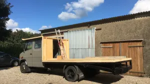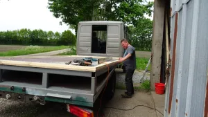Naja, der Kofferaufbau ist 6,50 m lang, 2,50 m hoch mit Doppelboden und 2,25 m breit. Die Bodenplatte ist aus 25 mm Siebdruckplatte. Dann noch die sieben Isolierglasfenster mit Sicherheitsglas.