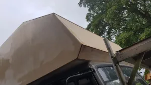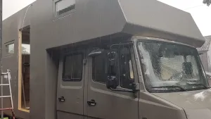 Die Wandelemente und die Dachelemente wurden dann auf der Bodenplatte montiert, final wurden alles Eckverbinungen zusätzlich mit 3 Lagen Glasgewebeband 120 mm breit und Epoxydharz laminiert. So sollte es wirklich komplett dicht sein. Dann abschließend den Kofferaufbau mit einer Struktur ähnlich Raptor versehen ( Steinschlagschutz auf Kautschukbasis ) und dann mit PU Lack lackiert.