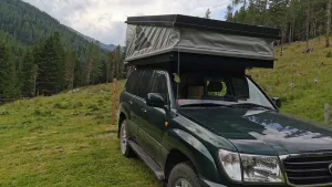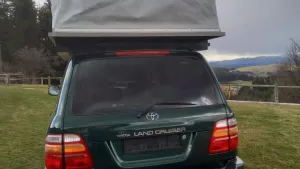 Das untere Bild zeigt das geöffnete Hochdach von aussen. Es ist fast parallen hochgeschoben, man kann es aber auch so einstellen, dass eine Seite ganz unten anliegt und den Seitenwind aussperrt.