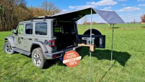 "Leider" ist mein Wrangler JK ein 2-Türer, da wird's eng, sonst würd ich mit dem was machen. Ich hab hinten alles drin was ich brauch, kann aber nicht drin kochen, sitzen oder gar schlafen. Es muss alles alles draußen stattfinden. So wie auf dem Bild wäre mein Notfallkonzept gewesen. Wie es meine Wrangler-Spezln mit 4-Türer lösen weiß ich.
