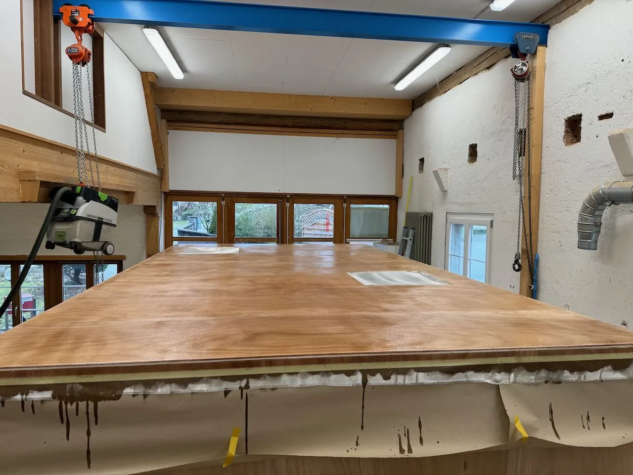 Das Dach und die Kanten haben wir mit Glasgewebe und Epoxi laminiert und anschliessend mit einer Epoxifarbe grundiert.