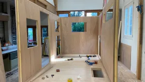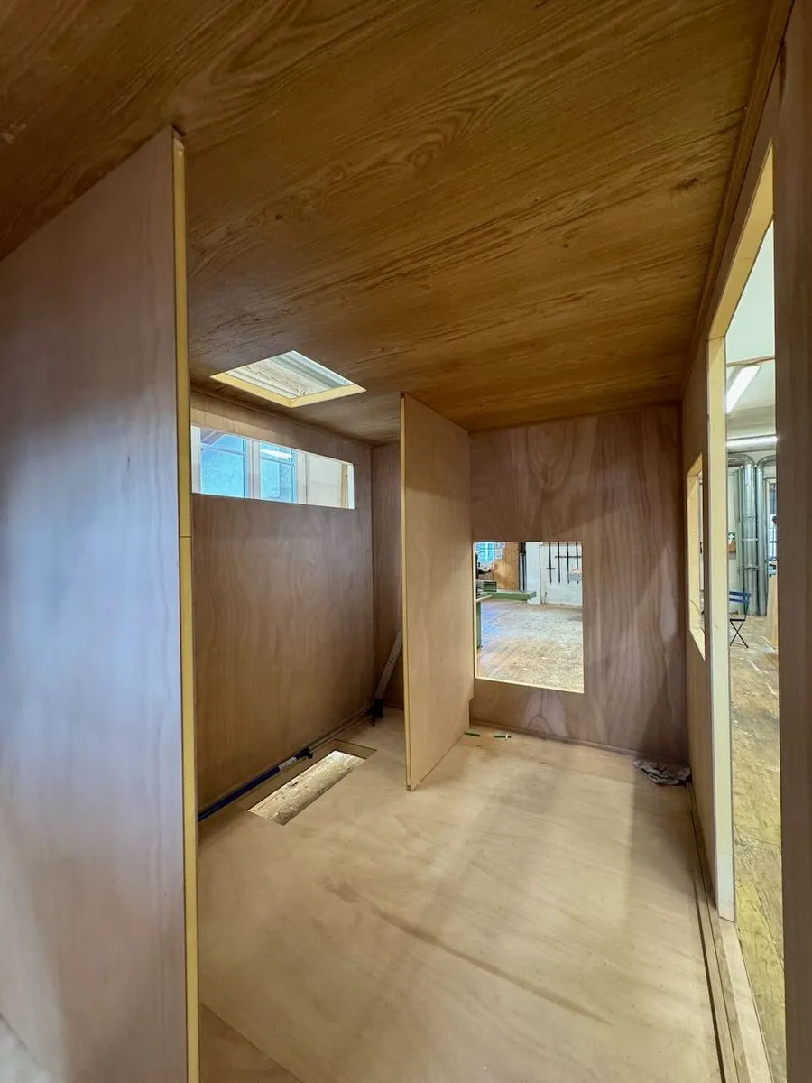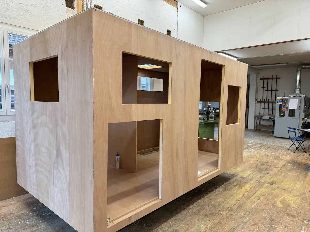 Es ist etwas weitergegangen die Kabine ist zusammengeklebt, wiegt mit den zwei Zwischenwänden 309 kg, mit Türe, Klappen und Gläser wird sie 440 kg haben.
