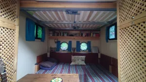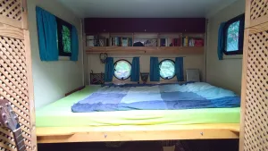 Unter dem Bett ist die Sofaecke und zwischen den Rückenpolstern 6 Stück 70x70mm Holzpfosten, auf die sich dann das Bett ablegt. Die Sofalehnen werden im abgesenkten Zustand zu einem Teil des Bettes. Die Heckablage, vor den runden Fenstern, kann mit angehobenem oder abgesenktem Bett genutzt werden.