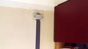 Für die 4 Aufhängungen bzw Führungsschienen sind sind je zwei 10x20x1400mm Alu L-Profile aufs GFK geklebt und genietet. Die Polyamid Umlenkführungsrollen bzw das 25mm breite Sicherheitsgurt-Zugband laufen auf dem GFK (siehe Bild). Auf diese Weise konnte eine sehr niedrig aufbauende Führungsschiene realisiert werden, die genau die richtige Breite hat. Am oberen Ende der Führungsschiene ist ein Klemmer aus 3 Aluplatten, der mittels Nietmuttern gegen die Führungsschienen geschraubt wird, um das hindurch gefädelte Zugband zu fixieren. So lässt sich die Länge des Zugbands schön einstellen, und das Bett austarieren.