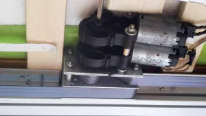 Der Zugmechanismus ist mit 4 Valeo/Nideq Getriebemotoren, wie sie für Rolläden oder zur KFZ Sitzverstellung hergenommen werden, gelöst. Je 2 auf einer Seite. Zuerst hatte ich 2 Motoren, aber die haben sich arg gequält, also habe ich nochmal 2 hinzugebaut. Nun läuft es wie Butter, und fährt in 30 Sekunden unter die Decke. Das ganze Bett mit Matratze müsste rechnerisch 42 kg wiegen, das war etwas viel für nur 2 Motoren, obwohl es rechnerisch gerade hätte klappen müssen. Als zentrale Welle dient ein kugelgelagerter 6x6mm 4-Kant Stahl, an die jeweils ein Alu-Klemmer aufgeschraubt ist, der die Zugbänder fixiert. Für das 4-Kant Stahl musste die Aufnahme im Getriebemotor geringfügig aufgefeilt werden. Im Gegensatz zu zb Rollladenmotoren habe ich nun einen recht geringen Wickeldurchmesser des Zugbandes von ca 50mm im aufgewickelten Zustand, und konnte deshalb einen niedrigen 60mm Rahmen realisieren.