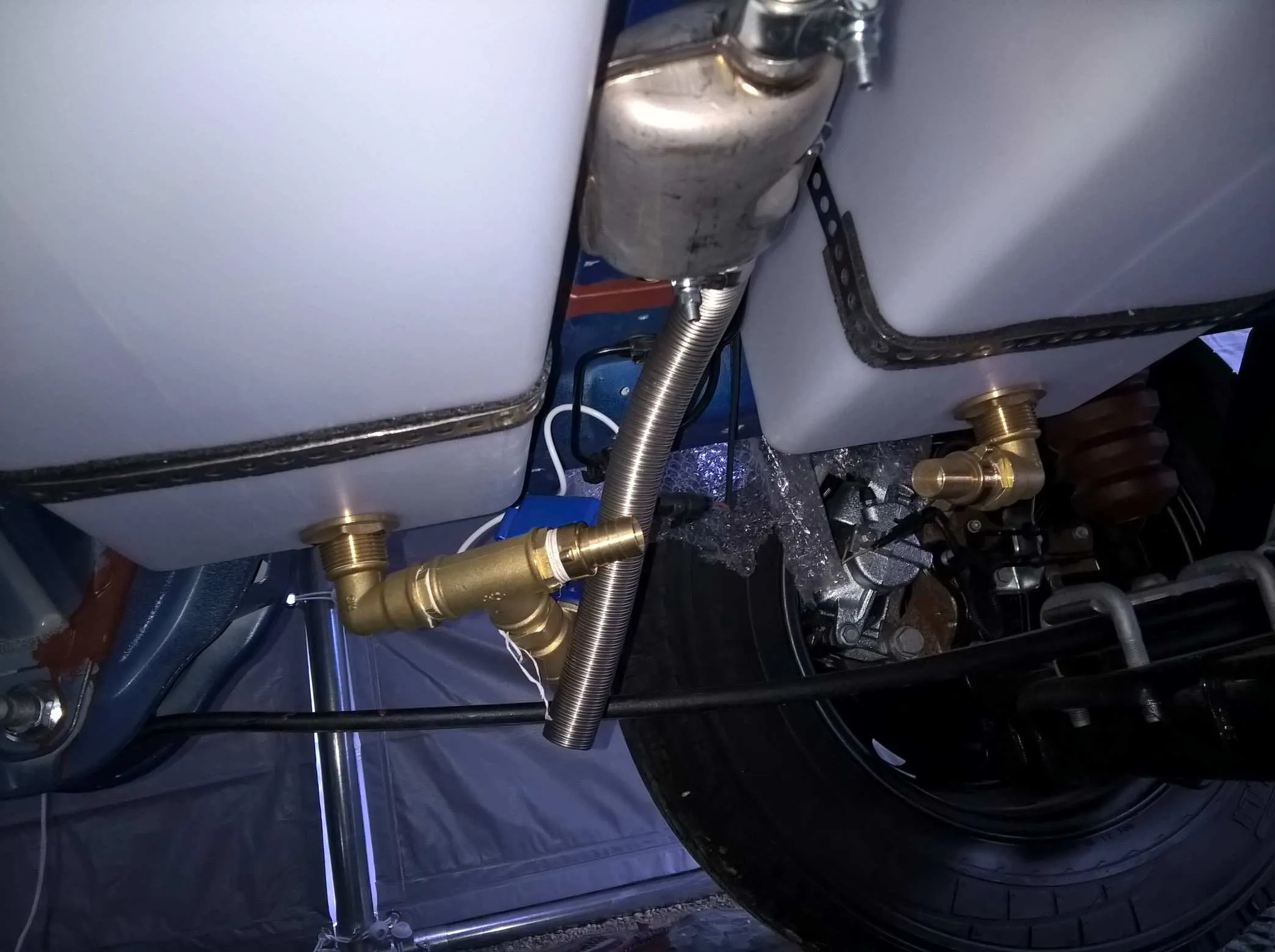 Bei mir sitzen zwischen den zwei Abwassertanks die zwei Standheizungen. Ein Auspuff bläst das Ablassventil an, der andere hält den außengeführten Abwasserschlauch von der Dusche frostfrei.